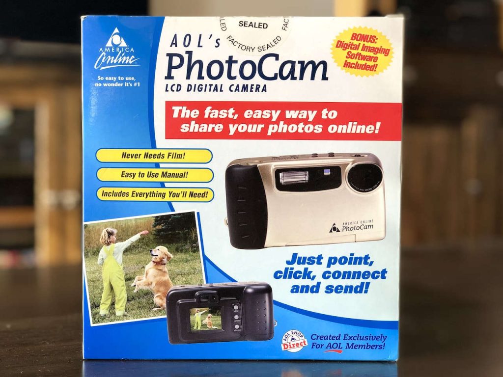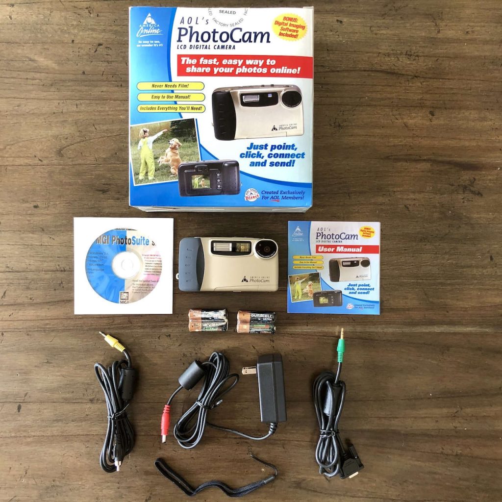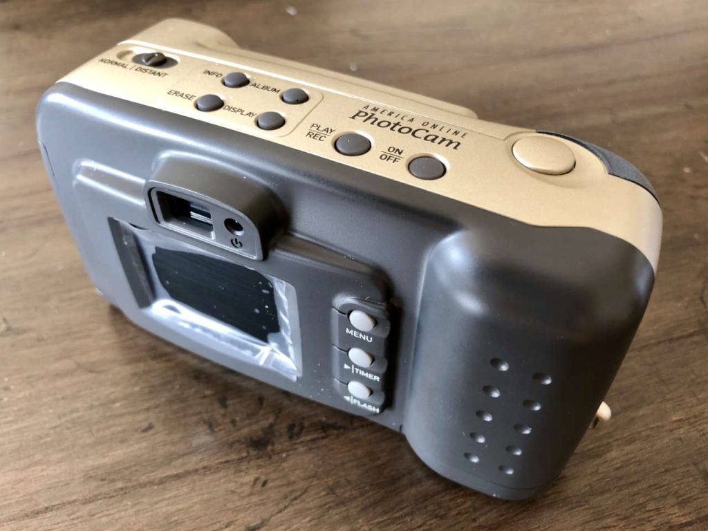 I did consider grabbing a used early Mavica but as I already owned one floppy disk based Mavica already it didn’t seem worth it. The QuickTake was interesting due to its shape, which had me considering other unusually shaped digital cameras but nothing really stood out. Then I came across a listing for a brand new in sealed box, AOL PhotoCam. No it wasn’t an interesting shape, and there’s nothing special about it’s removable media. I bought it purely because it was brand new and was by AOL who were a big deal in the late 90s. Although heavily criticized by geeks like me, they were by far the most popular ISP of that era, famous for sending millions of free signup CD-ROM’s through the mail and providing simplified access to the internet for the non computer literate public. It appears that AOL offered cut price digital cameras to its members as a sweetener, and back then a digital camera was still a fairly unusual and high tech item. At $200-$250 this was a very low to average camera, both in terms of price and performance, but this and similar cameras would have been far more common than the state of the art $1,000 ones from big name brands. So what did you get for your $200 back then? Let’s take a look!