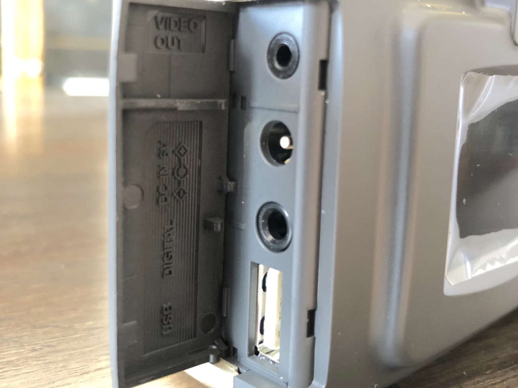 A flap on the left hand side opens up to reveal the ports. The top is a 3.5mm composite video out for connecting to a TV or VCR via the supplied RCA cable, beneath that is the 6V DC in jack for the included AC power adapter (the camera does not recharge batteries). Finally we have a 3.5mm jack labelled digital which uses the included cable to connect to a 9 pin serial port and below that we have a USB port for connecting to Windows 98 computers although the cable is not included in the box.