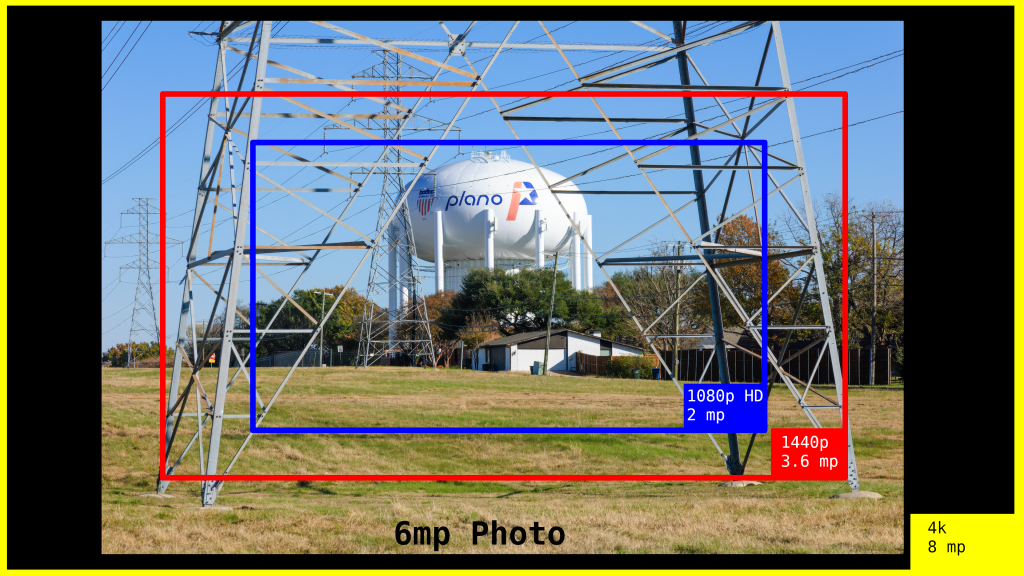 The first thing to consider is the 6 megapixels… I’ve overlaid the image and 3 common, modern monitor sizes below. It’s worth noting that while you would need a 7 megapixel camera to fill a 4k monitor vertically, on anything less you cannot display fit the whole image on the screen unless you size it down or zoom out which means the resolution is simply wasted. In other words, if your images are only going to be viewed through a screen, 6 megapixels is more than enough and according to the November 2025 Steam survey (which is of gamers who buy the latest and greatest computers), 96% of people are using a screen of 1440p resolution or less so 4k is extremely niche!