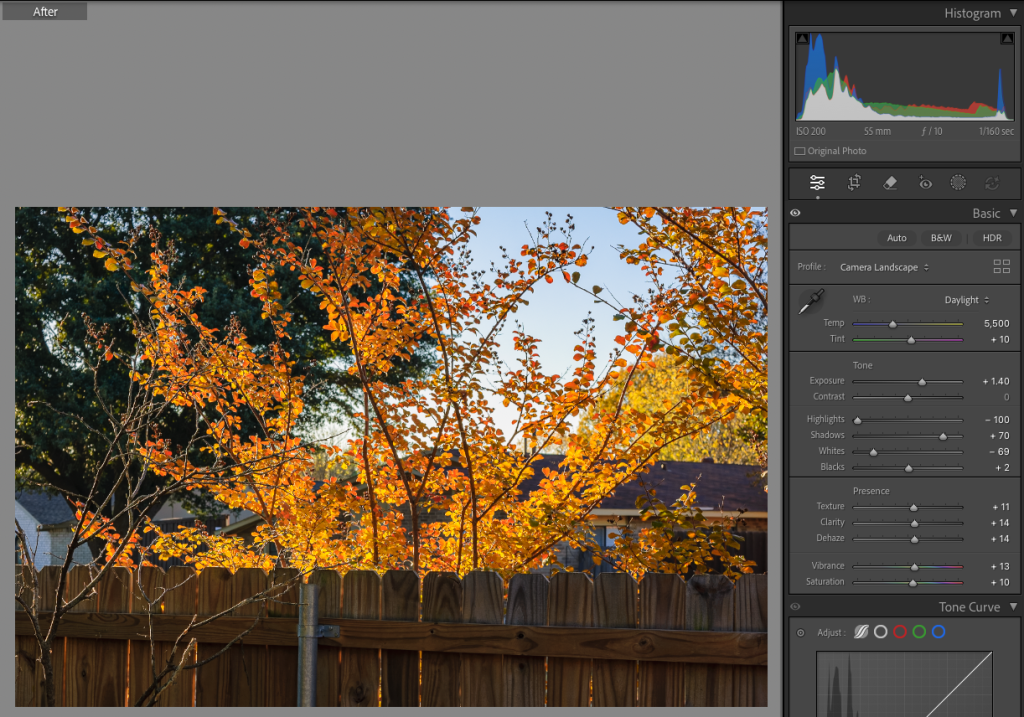 I then brought the exposure up 1.4 stops which made the leaves nice and bright, however this of course blew out the sky so I slid the highlight recovery slider all the way 100% to the left to recover it, then brought up the shadows by 70/100 to reveal the fence before boosting the colors slightly as you can see below. This entire process took less than a minute so it’s not much work: