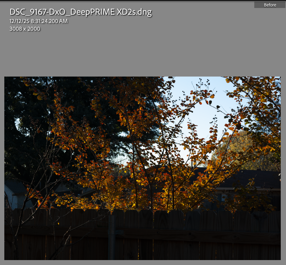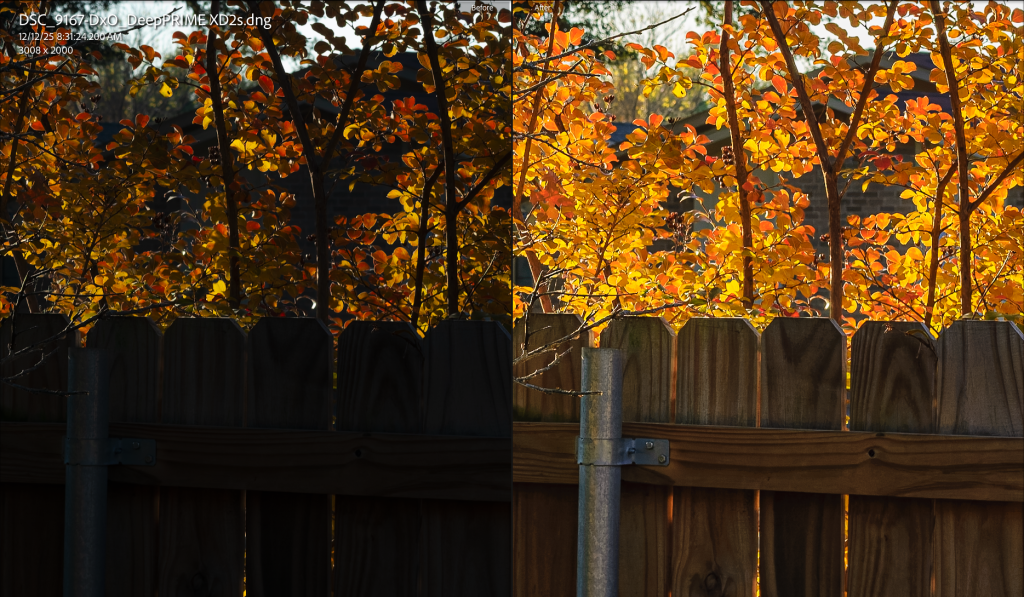 A newer camera would capture a lot more details in the shadows then this D40 but I would argue there is enough there assuming we’re not pixel peeping. Click below for a 1:1 (100% zoom) crop of the before and after side by side:
